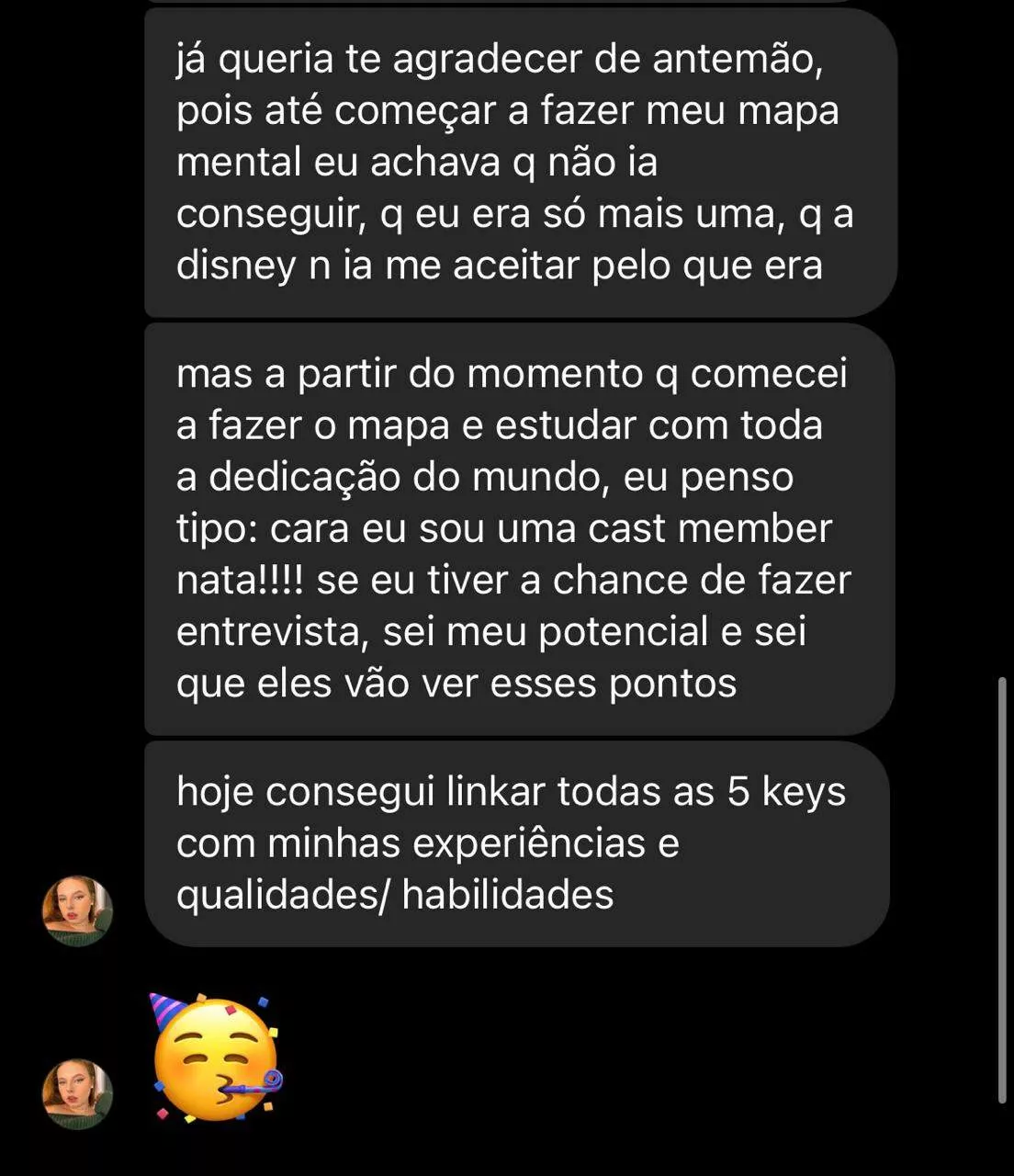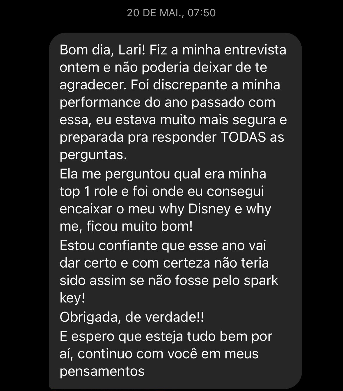 O Spark Key é muito mais do que um curso, é um passo a passo completo e prático para desbloquear o seu sonho de trabalhar na Disney, aprendendo tudo o que você precisa para passar pelo processo seletivo com confiança e autoconhecimento.